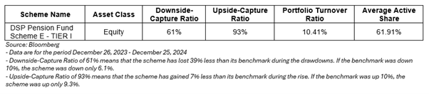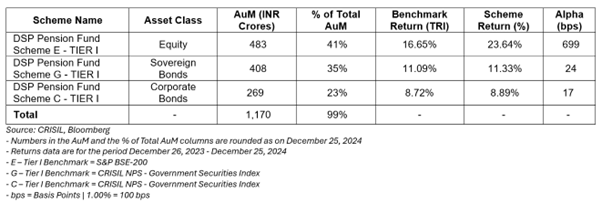 We, at DSP Pension Fund, began our operation on 26th December 2023. On 1st January 2024, we invested your first rupee across our schemes. From Rs.0 to ~Rs.1,200 Crores of AuM (Assets Under Management), our first year was both exciting and challenging - from helping our investors understand our value proposition to managing our growing AuM effectively across our 8 schemes - as equity and bond markets rallied. In this update, however, we are primarily going to focus on 3 of our Tier I schemes that comprise ~99% of our subscribers’ capital managed by us.