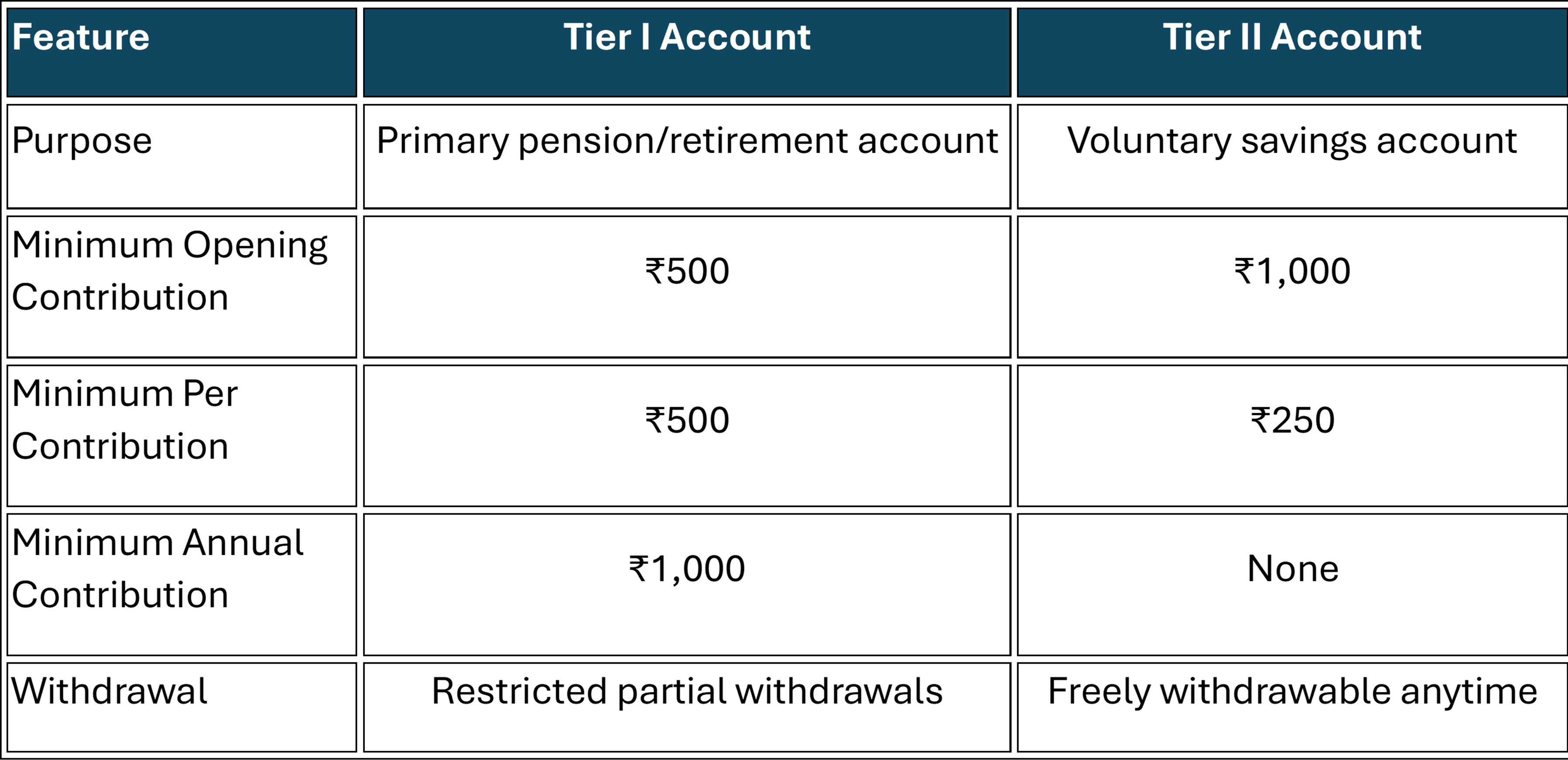 • There are two account types: Tier I (pension account with lock-in) and Tier II (voluntary savings with no lock-in).